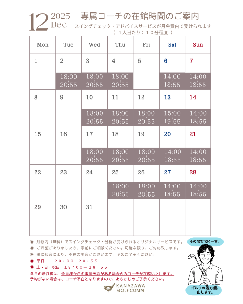 すっかり冬も近づいてまいりましたが、Kanazawa Golf Commは全く関係なく、常に快適に練習・ラウンド等をお楽しみいただけます。今月もコーチングアワーの予定をご案内いたしますので、皆様の豊かなゴルフライフの一助となるよう、ぜひご活用くださいませ。